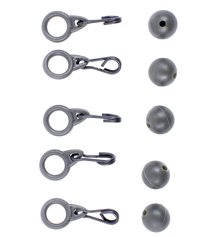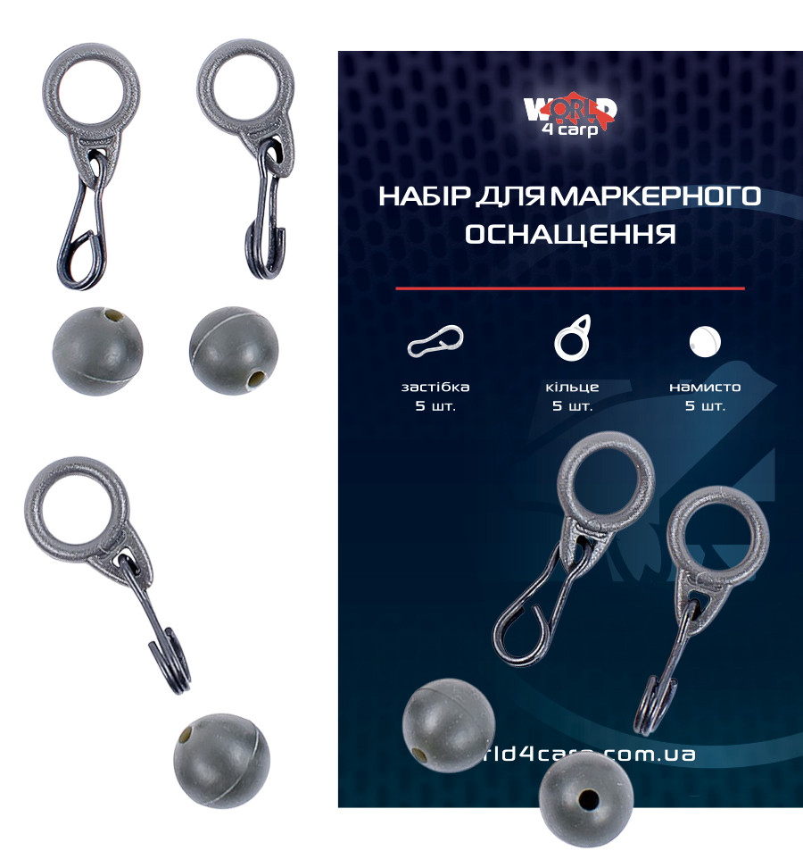 Набор для маркерной оснастки состоит из резиновой бусинки пластмассового кольца и быстросъёмной застёжки. Бусинка амортизирует усилие на маркерный поплавок во время заброса, кольцо с большим отверстием отлично пропускает через себя монолидер. Застёжка используется для быстрой замены грузов.