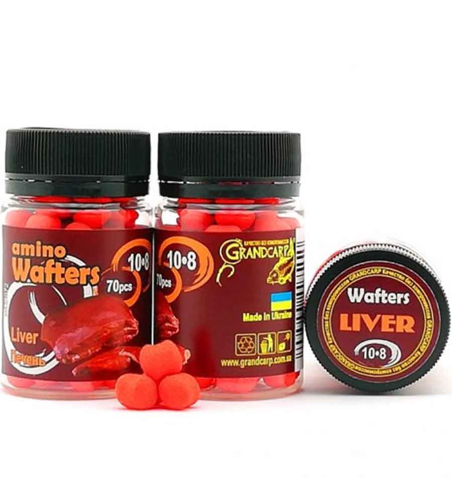 Бойлы нейтральной плавучести Grandcarp Amino Wafters Liver (Печень) Эти бойлы в форме дамбеллсов немного легче воды, но их подъемной силы все же недостаточно, чтобы оторвать крючок от дна. Поэтому при их использовании можно получить очень интересную презентацию, когда крючок лежит на дне, а бойл приподнят над ним на длину волоса