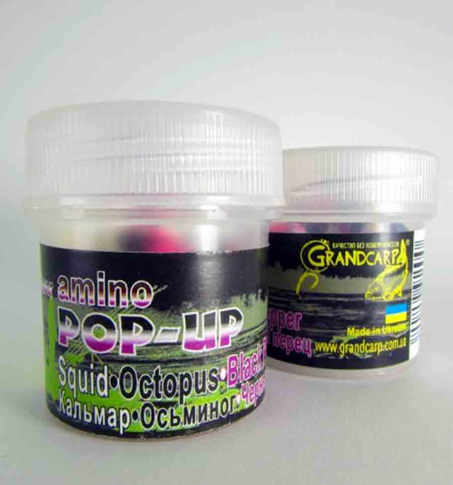 Амино поп ап КАЛЬМАР•ОСЬМИНОГ•ЧЕРНЫЙ ПЕРЕЦ Grandcarp Ø10 мм 15 шт. Карп, конечно живет в пресной воде, но морепродукты никогда не оставят его равнодушным. Сочетание ароматов кальмара и осьминога, приправленное черным перцем, это именно то, что спасет вас даже в бесклевье.
