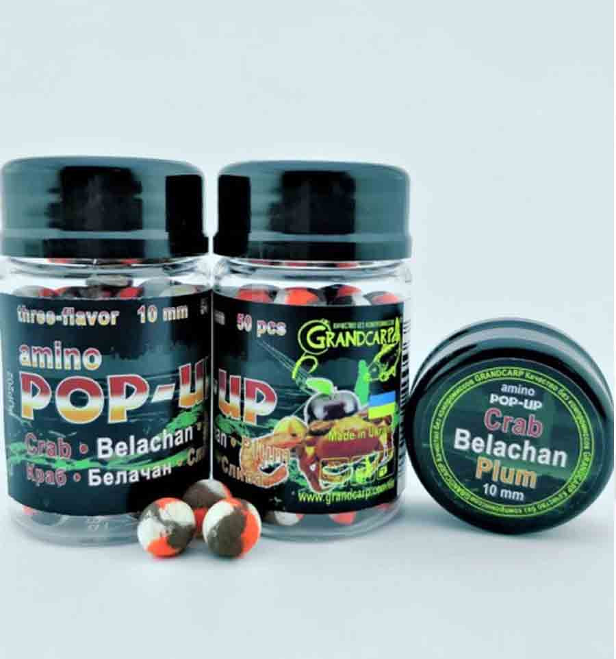 Амино поп ап КРАБ•БЕЛАЧАН•СЛИВА Grandcarp Ø10 мм. обладают сложным комбинированным запахом и яркой трехцветной окраской, но и насыщены большим количеством высокоэффективных привлекающих веществ, благодаря чему рыба очень быстро находит эти бойлы и не может устоять перед их притягательной силой.