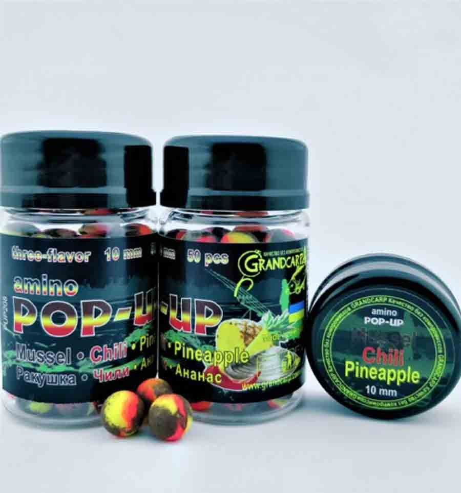 Амино поп ап РАКУШКА•ЧИЛИ•АНАНАС Grandcarp Ø10 мм. Сложный запах и яркий цвет дополнительно выделяют эти поп-апы как на фоне дна, так и на фоне любой прикормки, поэтому рыба точно не проплывет мимо этого амино поп-апа.