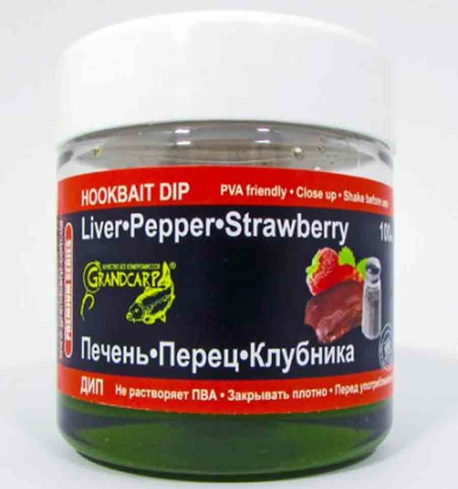 Активный дип ПЕЧЕНЬ•ПЕРЕЦ•КЛУБНИКА Grandcarp серии PREMIUM 70 мл. является мощными средством для выделения насадки любого вида (от кукурузы до бойлов) на фоне прикормки. Состав наших дипов является результатом большой экспериментальной работы, проведенной на различных водоемах как в соревновательных условиях, так и на обычных рыбалках