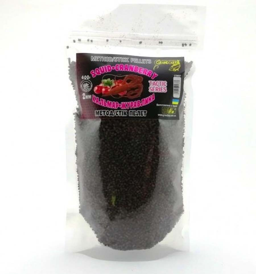 Метод/Стик пеллет Grandcarp КАЛЬМАР•КЛЮКВА серии TACTIC Ø2 мм, 400 г Этот пеллет диаметром 2 мм подходит как для наполнения флет-кормушек, так и для использования в ПВА стиках (и в качестве самостоятельной прикормки, и в качестве добавки к стик-миксам)
