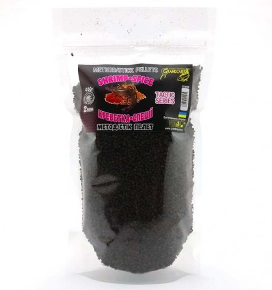 Метод/Стик пеллет Grandcarp КРЕВЕТКА•СПЕЦИИ серии TACTIC Ø2 мм, 400 г Этот пеллет диаметром 2 мм подходит как для наполнения флет-кормушек, так и для использования в ПВА стиках (и в качестве самостоятельной прикормки, и в качестве добавки к стик-миксам)