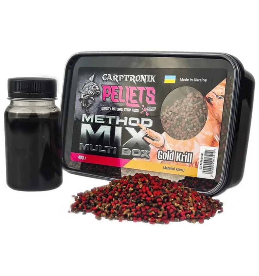 метод микс премиум-класса Carptronik Method Mix Multi Box - Gold Krill, разработанный для максимального привлечения рыбы благодаря насыщенному аромату и вкусу криля. В комплект входят пеллетс высшего качества и 100 мл жидкого аттрактанта.