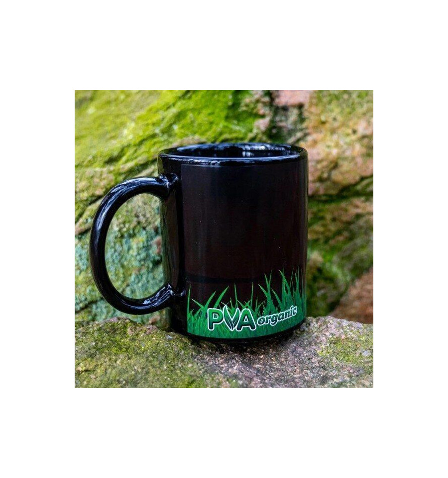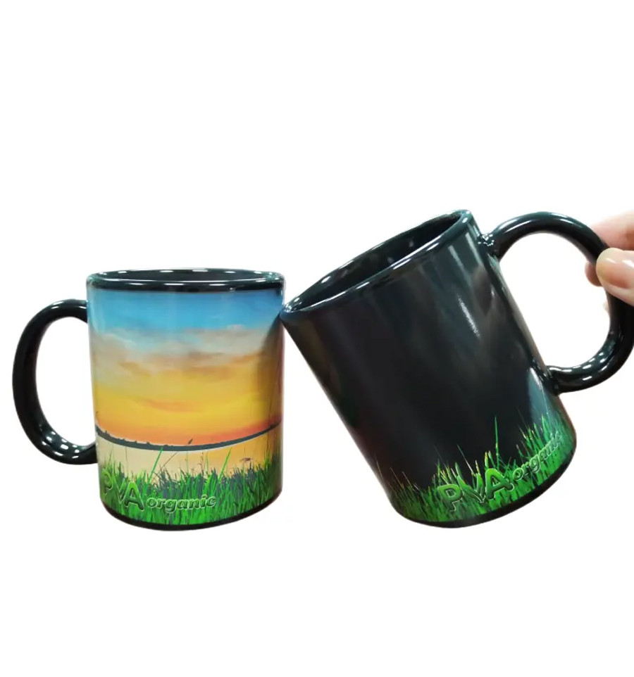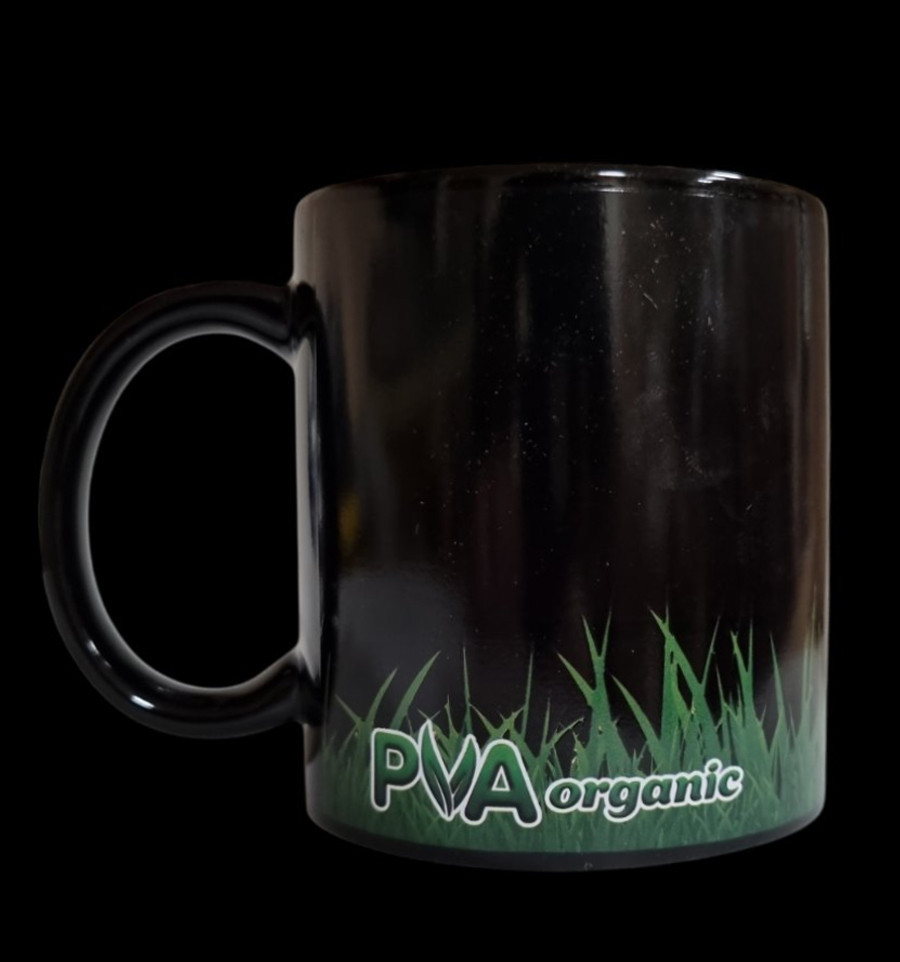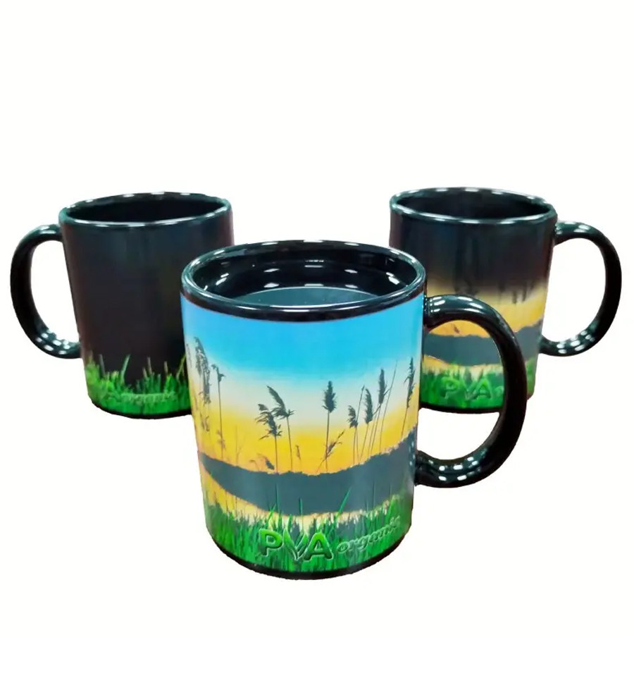 Керамическая чашка от фирмы KATRAN в сдержанном стиле со стилизованной надписью PVA Organic. Керамическая кружка, которая меняет изображение в зависимости от температуры воды.