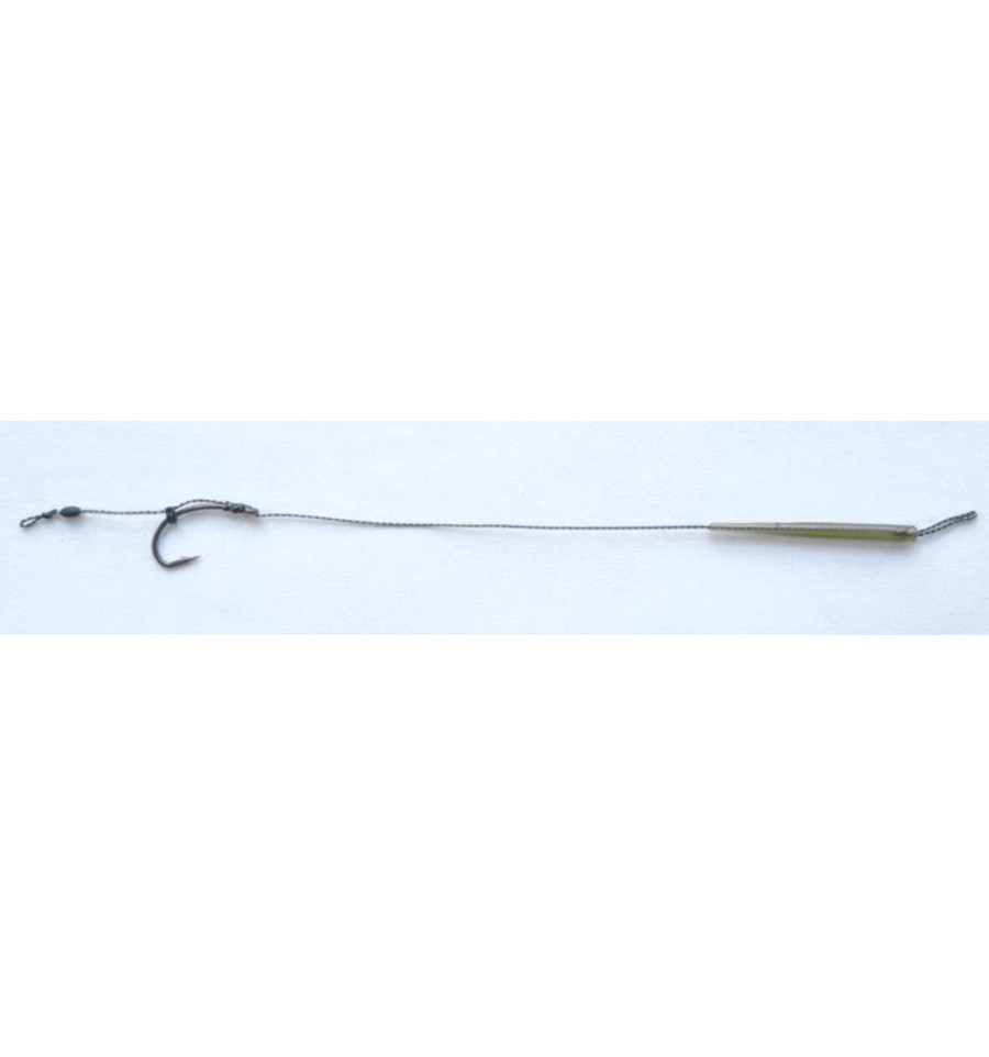 Для быстрой смены поводка в этой модели готового поводка применяется силиконовый хвостовик тёмно-зелёного цвета. Хвостовик надежно фиксирует поводок на вертлюге и за счет своей упругости предотвращает запутывание поводка о монтаж при забросе. Длина хвостовика – 40 мм.
