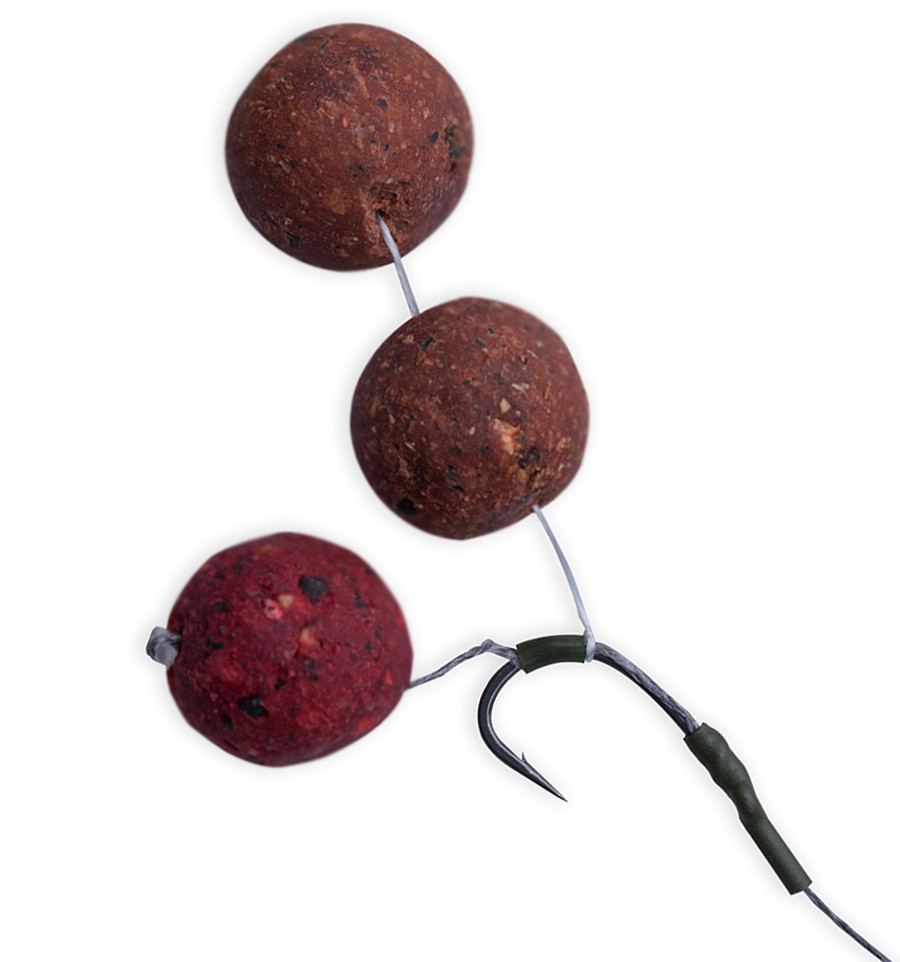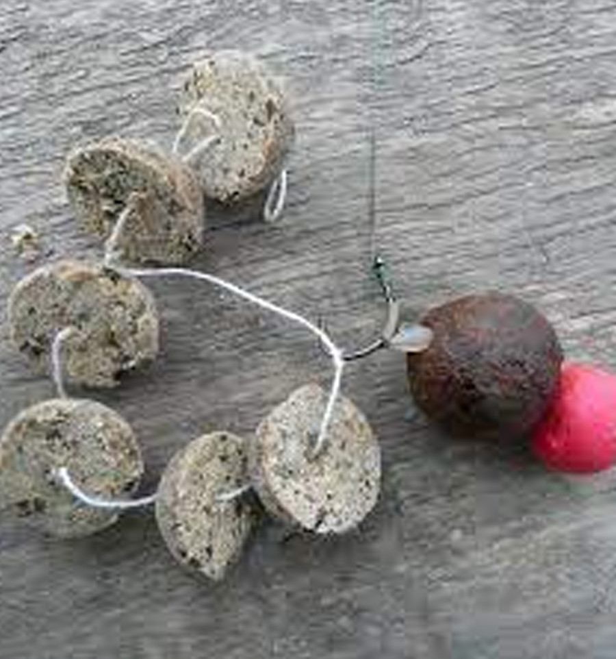 Применяется для формования из насадочных-бойлов прикормочной цепочка. Также нить используется для вспомогательных целей (завязать пакет или сетку, прикрепить их к оснасткам). Важно помнить, что бойлы необходимо крепить на расстоянии друг от друга, чтобы нить растворялась. Чем более толстая нить используется, тем более массивную приманку можно забросить.