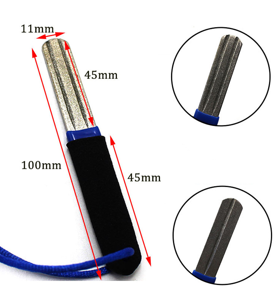Точилка для рыболовных крючков с алмазным напылением. Инструмент имеет 2 стороны с различной степенью абразивности, одна сторона для грубой заточки (400) а вторая сторона для доводки с мелким зарном (200)