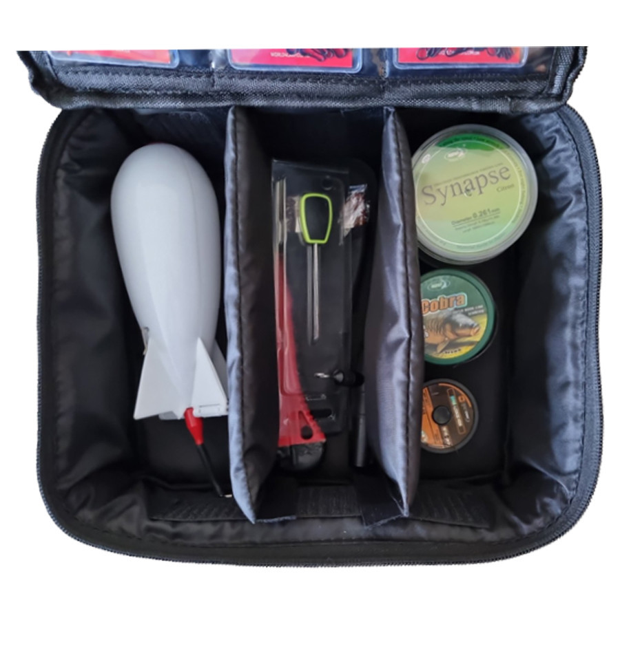 В эту часть легко поместится ПВА система в тубусе, спомб для прикормки, маркерный поплавок. Для тех, кто ловит на флэт, сумочка отлично вмести в себя даже котушку со шпулей 6000, леску и кормушки.