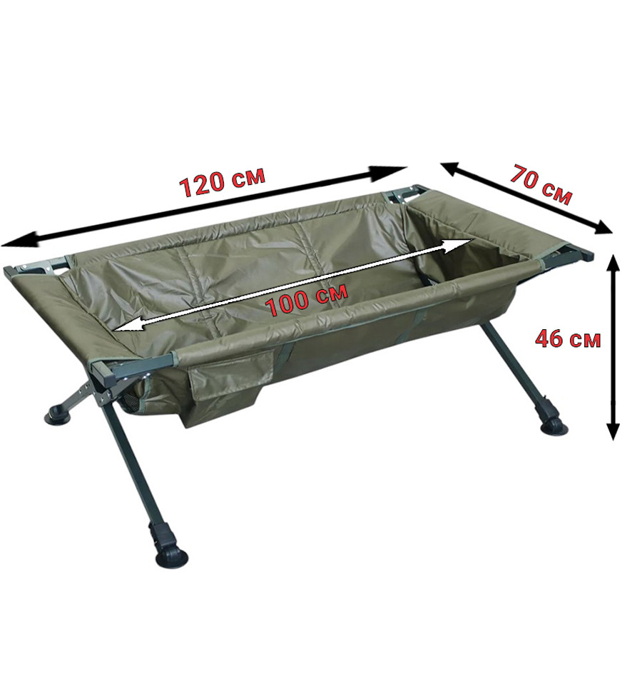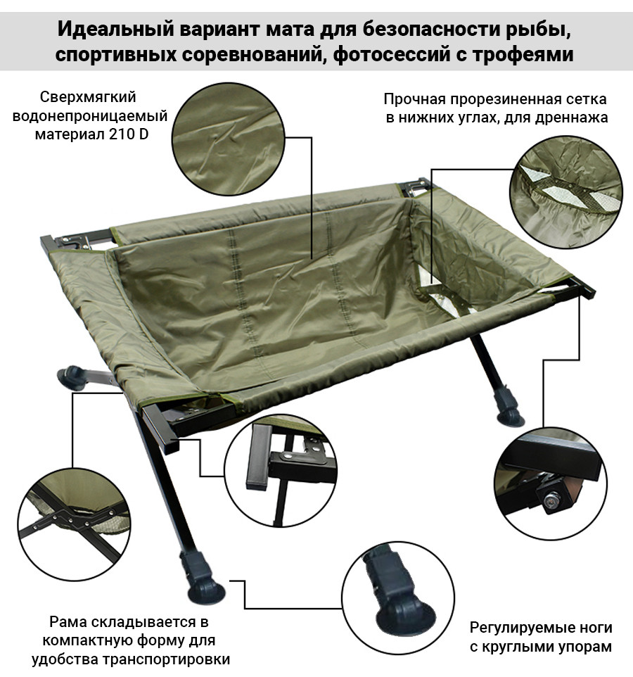 Глубина мата при отсутствии нагрузки (без рыбы) составляет 22см. Средняя высота регулируемых ножек – 50см. Общий вес аксессуара - 5,1 кг.