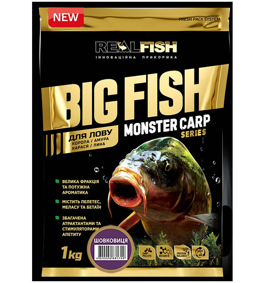 Прикормка с высоким содержанием протеинов и аминокислот, производимая из отборных ингредиентов премиального качества. Благодаря богатому содержанию компонентов и большой фракции эта смесь быстро привлекает и долго удерживает рыбу в точке кормления. Разработана специально для рыбалки на трофейного карпа и амура в озерах и реках с сильным и слабым течением. С успехом может применяться для ловли с использованием методных и фидерных кормушек разнообразных конструкций, а также для спод-миксов и ПВА-стиков.