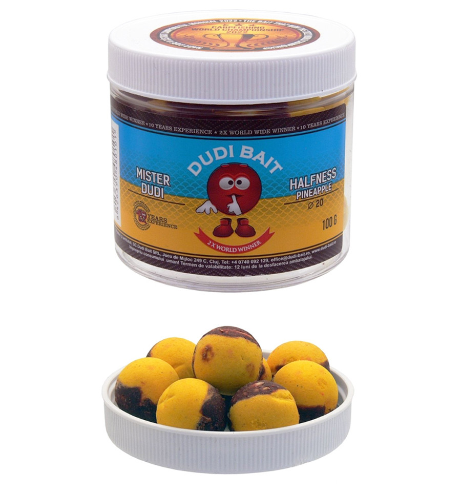 Представляємо унікальні збалансовані бойли Dudi Bait Halfness – інноваційне поєднання тонучого та плаваючого бойла в одній приманці! Ця розробка від Dudi Bait поєднує переваги поп-апів, вафтерсів та донних бойлів, мінімізуючи їх недоліки.