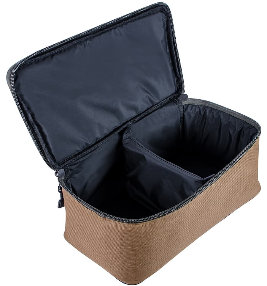 Сумка чохол для котушок оснащена перегородкою на липучках, що дозволить з комфортом та безпеку розмістити 2-і коропові котушки будь-якого типорозміру. Щільна тканина оксфорд у новому кольорі Coyote (коот) в сукупності з напівжорстким наповнювачем повністю захистить коротові котушки від впливу зовнішнього середовища. Чохол оснащений зручною гумовою ручкою, що дозволить з комфортом транспортувати ваші улюблені котушки. Для зручності експлуатації бігунки на змійці оснащені додатковими мотузками із пластмасовими замочками.