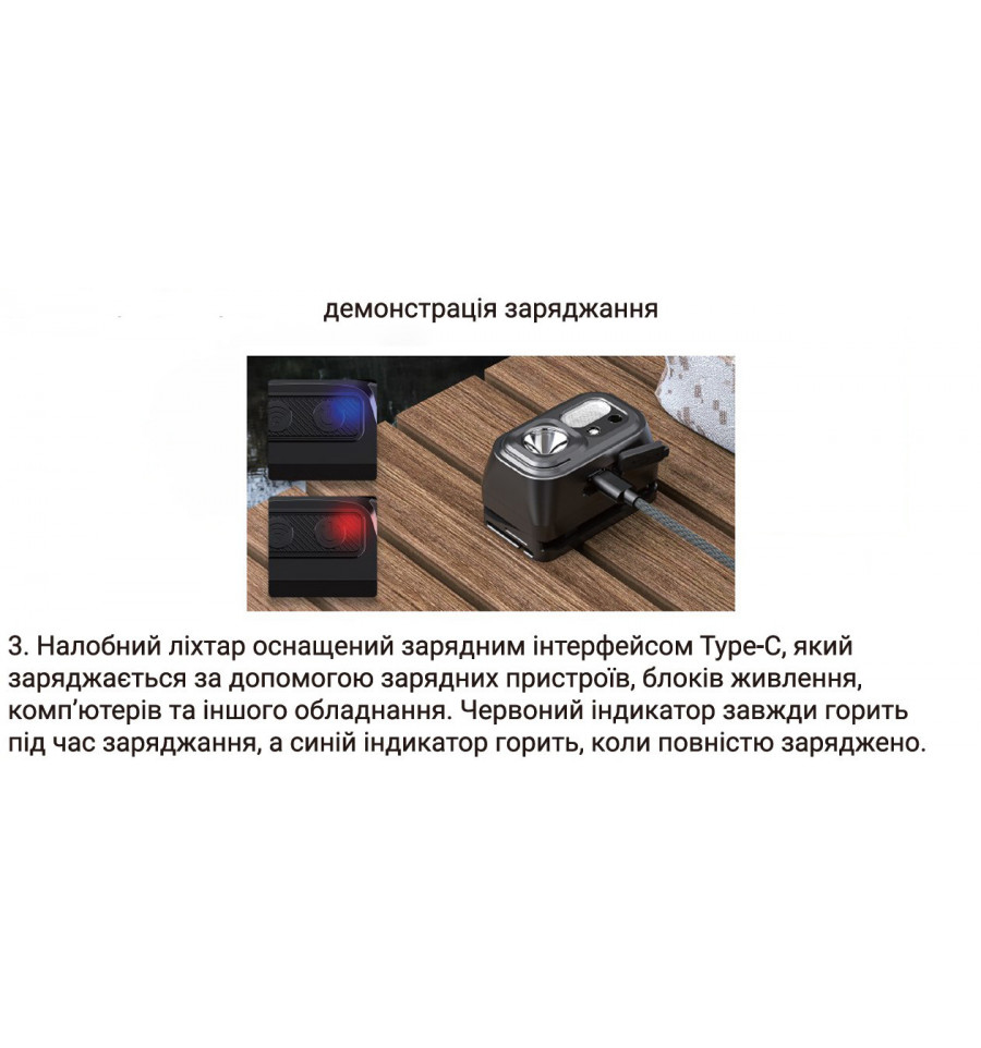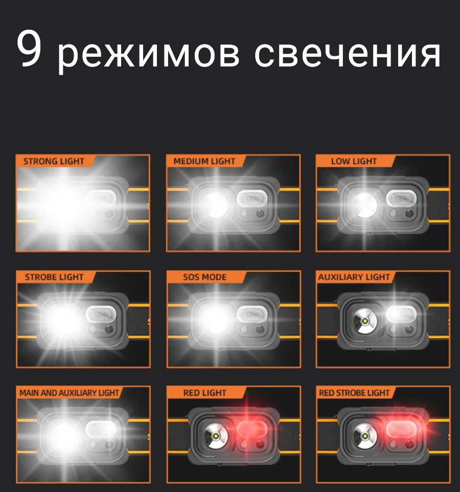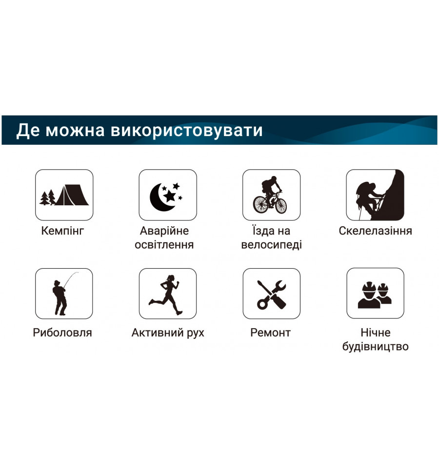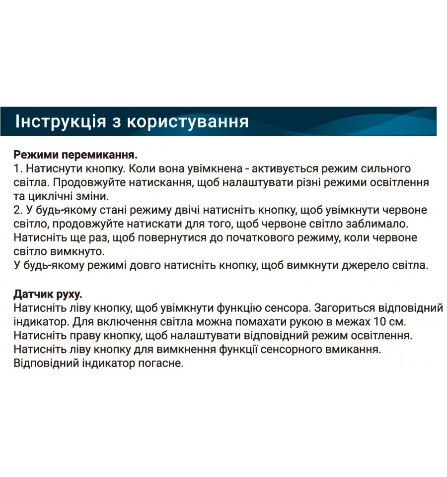 | Режими роботи | 9 режимів освітлення (сильний, середній, слабкий, стробоскоп, SOS, додатковий, червоний) |