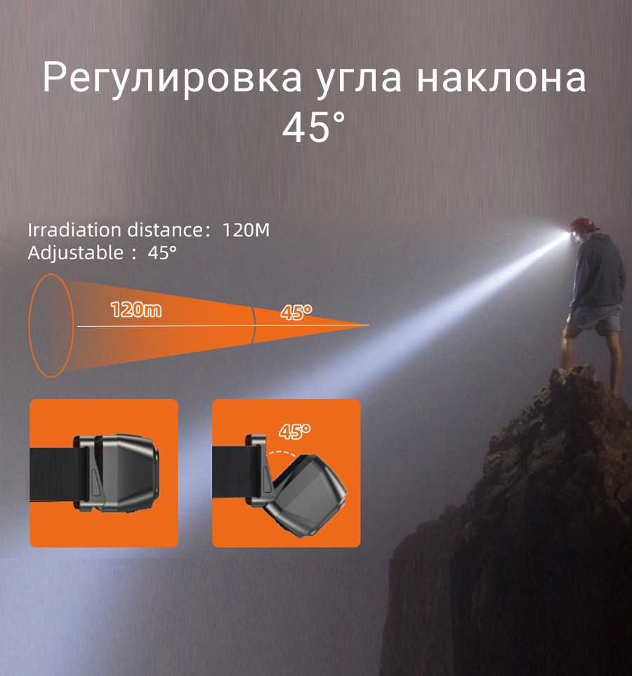 Головку ліхтаря можна відрегулювати на 45 градусів, щоб висвітлити всі мертві зони, і її можна плавно нахиляти одним пальцем. Гарантує відсутність сліпих зон на свіжому повітрі. Максимальна відстань освітлення становить близько 120 м-коду.