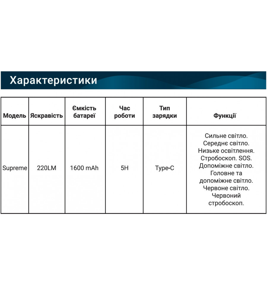 У порівнянні з іншими ліхтарями налобний ліхтар SUPREME відрізняється легкою вагою і стильним дизайном. Крім того, цей світлодіодний ліхтар налобний може працювати до 8 годин при слабкому освітленні, забезпечуючи тривалість освіщення. Це неперевершений варіант для кемпінгу, читання, нічних пробіжок, риболовлі, ремонту та інших ситуацій.