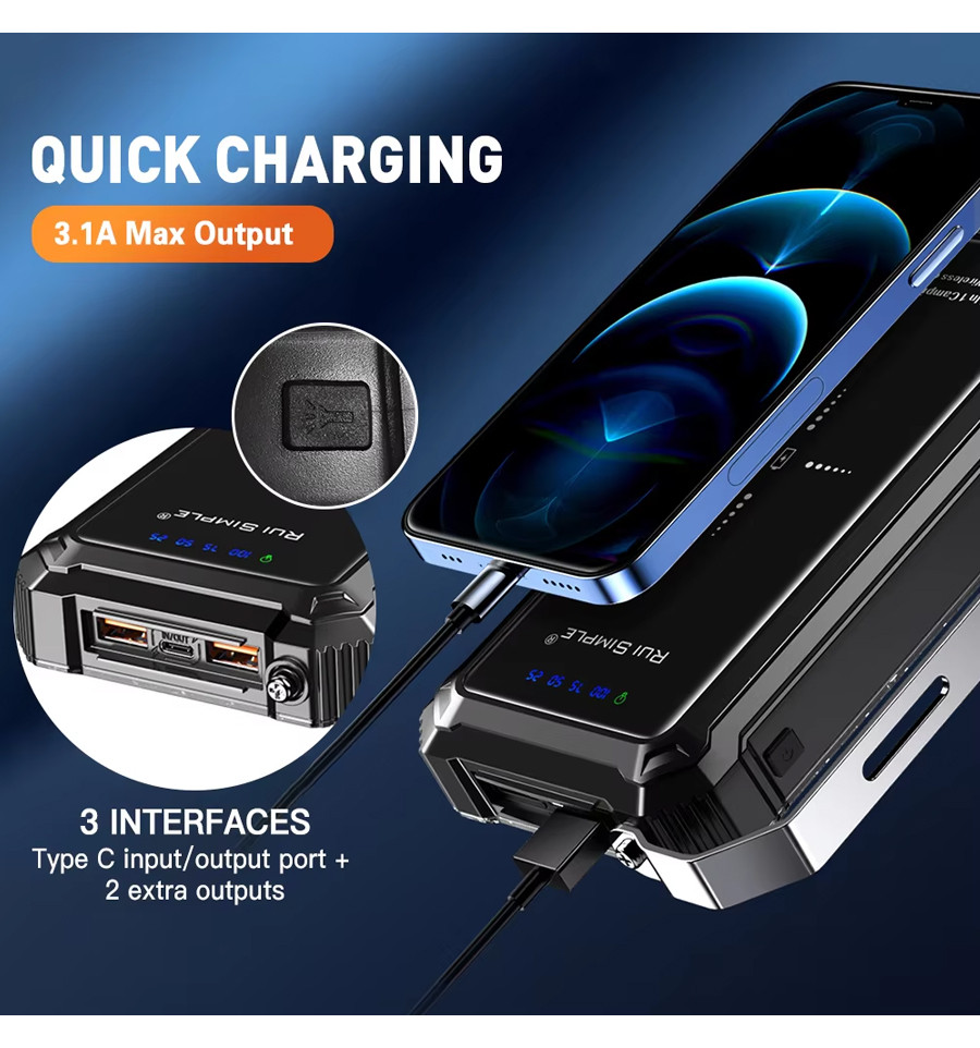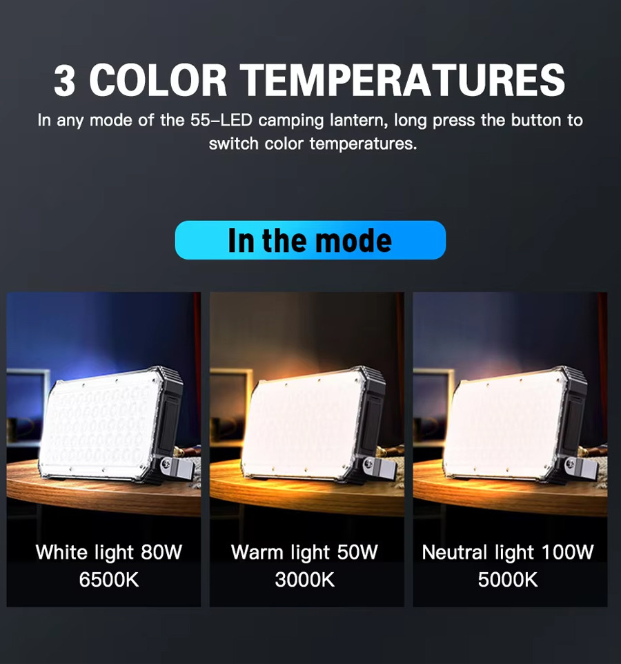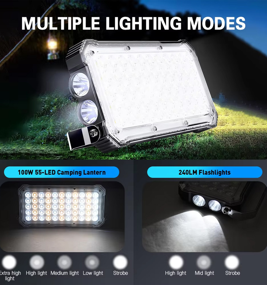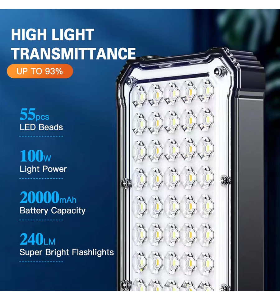 Цей багатофункціональний LED-ліхтар стане вашим незамінним помічником у будь-якій ситуації. Завдяки вбудованому акумулятору ємністю 20000 мАг, він забезпечить до 40 годин безперервного освітлення в режимі мінімальної яскравості та до 8 годин у режимі максимальної яскравості. Крім того, він може зарядити ваш смартфон 2-3 рази, що робить його ідеальним для кемпінгу, риболовлі чи аварійного освітлення.