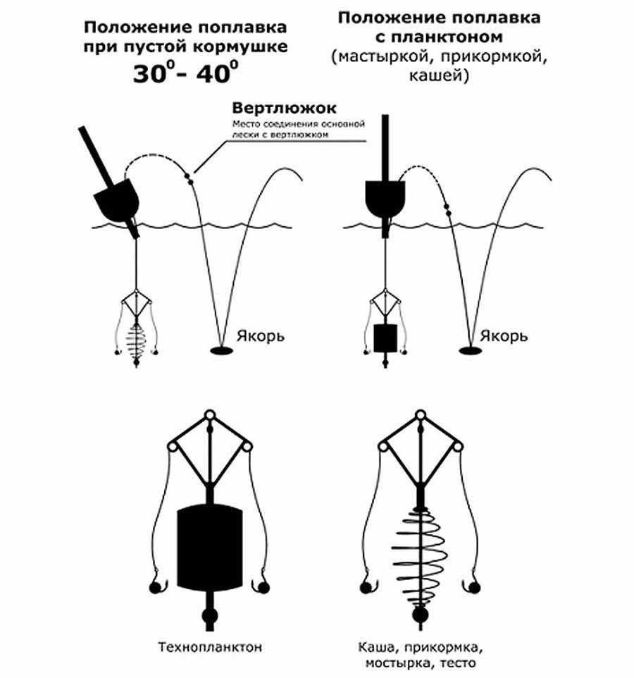 Ця конструкція снасті має на увазі справді результативний лов товстолобика, так як ця риба не донна, а мешкає в середні товщі води, і харчується вона різною рослинністю. Приваблює її каламут, яку створює підгодовування-гейзер. Годівницю можна зняти і надіти барило "ТЕХНОПЛАНКТОН". Це проста засушена спресована підгодовування, яка має різний склад інгредієнтів та ароматизаторів.
