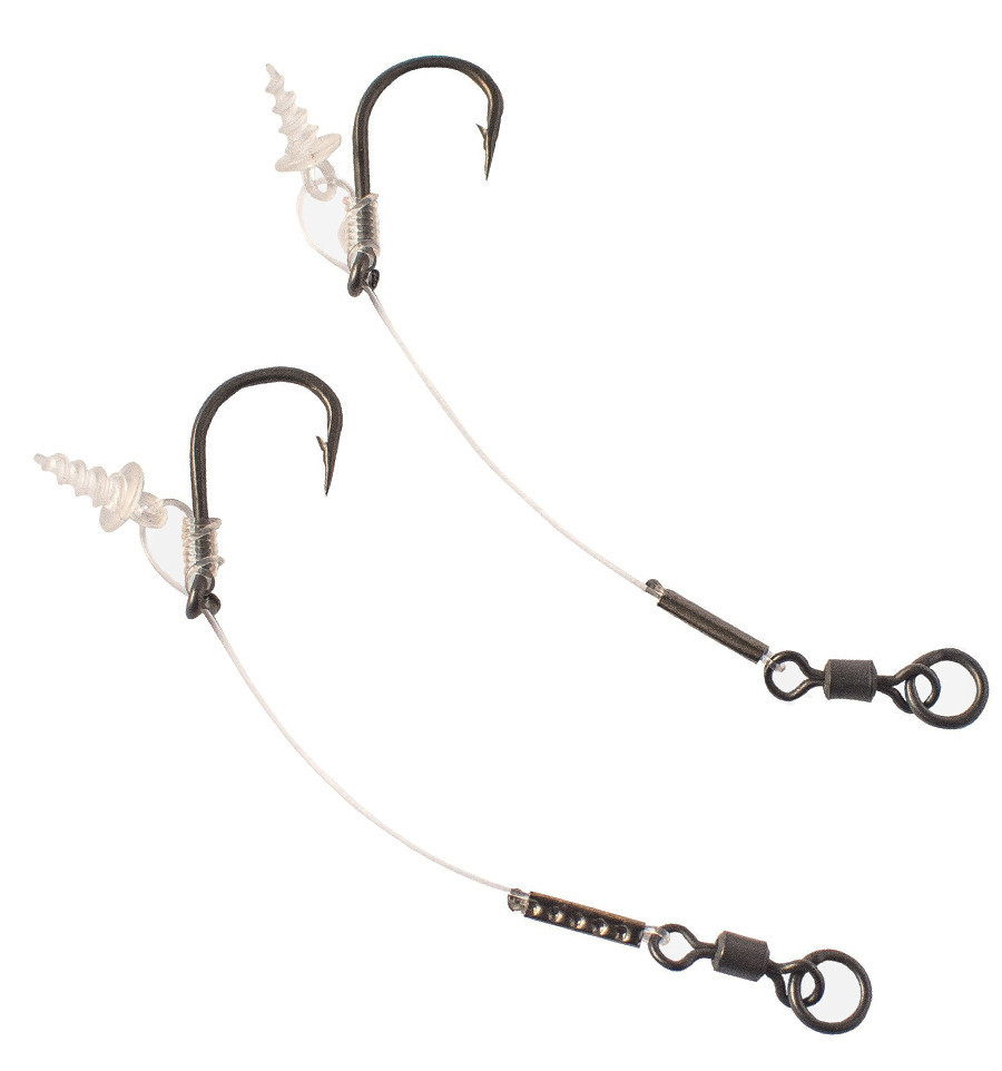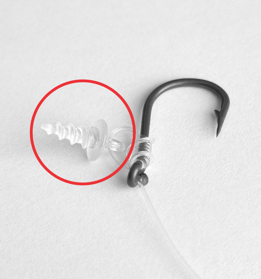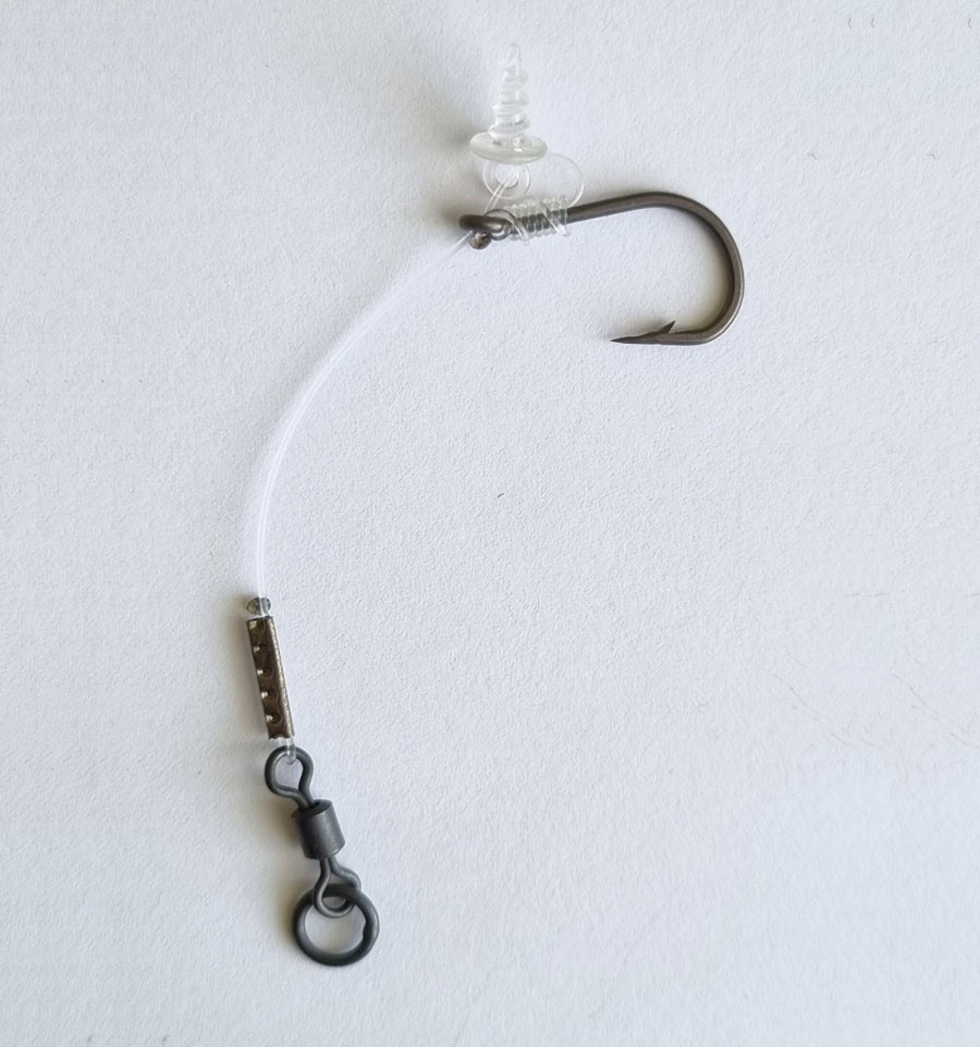 Край флюорокарбону який кріпиться до вертлюга обтиснутий за допомогою спеціальних кусачок Krimp Tool. Це надає додаткової надійності вузлу та мантажу загалом.
