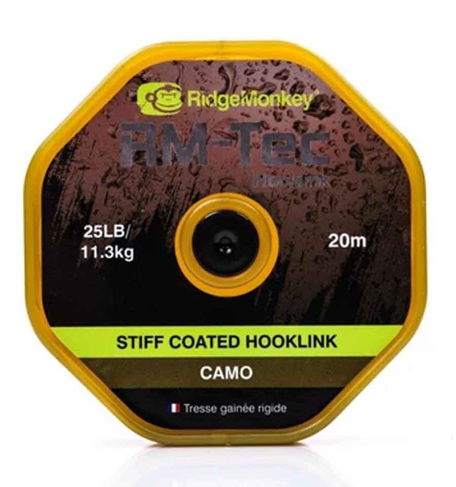 Повідковий матеріал RidgeMonkey RM-Tec Stiff Coated Hooklink з плетеним серцевиною і жорсткою оболонкою, що видаляється, застосовується для лову на плаваючі насадки на твердому дні. Завдяки підвищеній жорсткості перешкоджає заплутуванню оснащень. Висока стійкість до стирання RM-Tec Stiff Coated Hooklink забезпечує впевнене та надійне виведення трофеїв серед підводних перешкод.