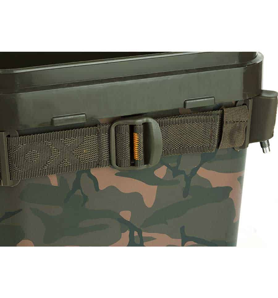 Вам не потрібно наглухо кріпити формовані фіксатори на цебра. Помаранчева прострочка, що вказує розмір, забезпечує оптимальне натяг для роботи з усіма цебрами Fox (5л, 10л і 17л). Просто розташуйте кольоровий прострочку в зазорі регульованої пряжки і вставте відро вузьким кінцем вперед у ремінь, що утворився.