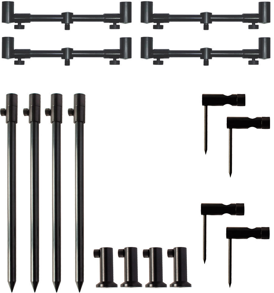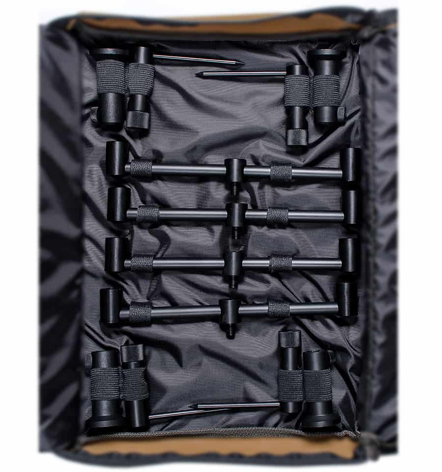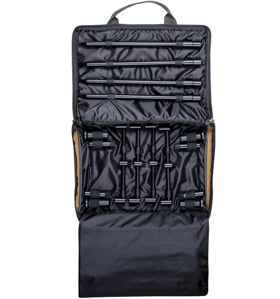 Практичний малогабаритний набір стійок, буз барів, стійок для помосту та стабілізаторів у сумці-чохлі. Набір розрахунків на 4 коропові удилища. Займає дуже мало місця та має легкий вес. Матеріал виконання обладнання – алюміній, а чохла – водонепроникний оксфорд кольору Coyote (Койот).