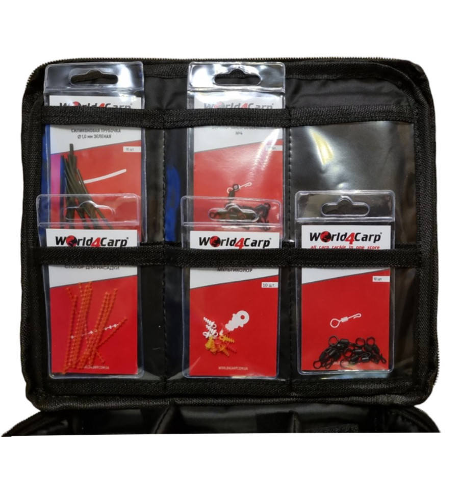 Наступне відділення має 12 прозорих кишень розміром 9 х 8 см для гачків, лідкорів, стопорків, монтажів та іншої дрібниці, по 6 з кожного боку. Тут зручно зберігати готові монтажі, гачки, вертлюги та інші дрібні аксесуари.