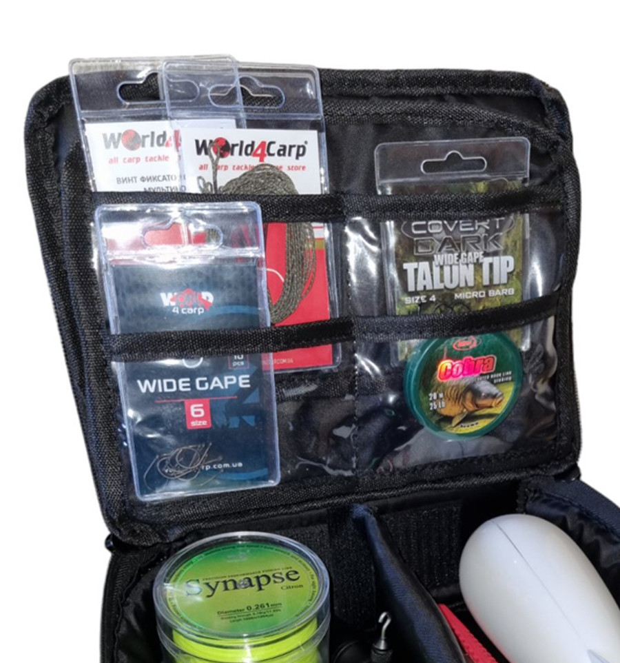 Наступне відділення має 8 прозорих кишень розміром 10 х 7 см для гачків, лідкорів, стопорків, монтажів та іншої дрібниці, по 4 з кожного боку. Тут зручно зберігати готові монтажі, гачки, вертлюги та інші дрібні аксесуари.
