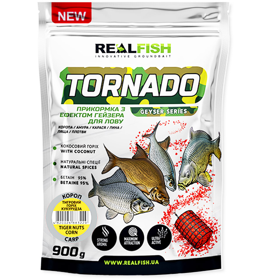 Серія TORNADO – прикормка з ефектом ГЕЙЗЕРА. Ця прикормка розроблялася в співпраці з найкращими та найзавзятішими риболовами з усіх куточків нашої країни. І нарешті можемо з гордістю вам представити дійсно довершену ідальну суміш. Завдяки поєднанню цих смаків, які підсилюють і доповнюють один одного - короп знайде вашу насадку дуже швидко.